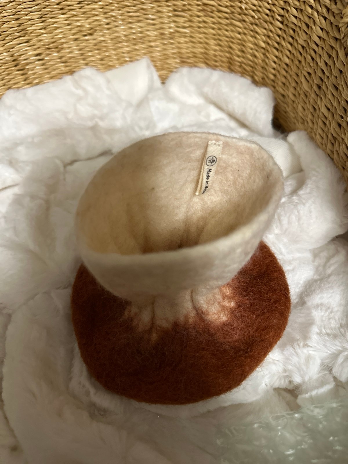 The woodland friends modeled this hat off of the mighty chanterelle, which is one of their favorite varieties of mushroom. Jeremy Owl tells us that wearing it gives him great foraging confidence, and also keeps his ear feathers nice and warm. It is made from wool felt in a rich auburn color that fades beautifully into ivory at the base. The snug fit and the felt’s naturally grippy texture helps this hat stay put on most animal’s heads, though we probably wouldn’t recommend it for toads. Handmade with a traditional wet-felting technique by our artisan partners in Nepal. Sublime!