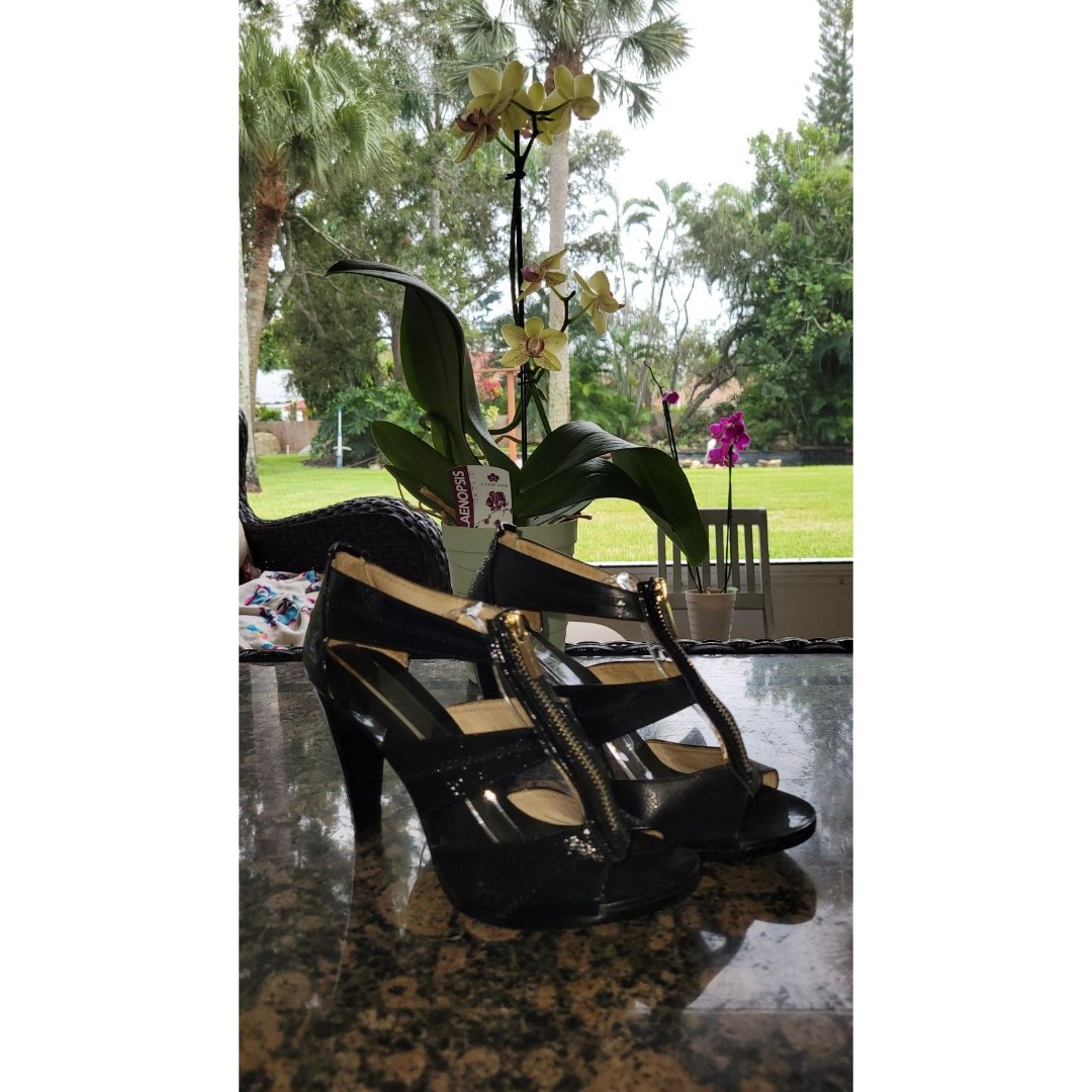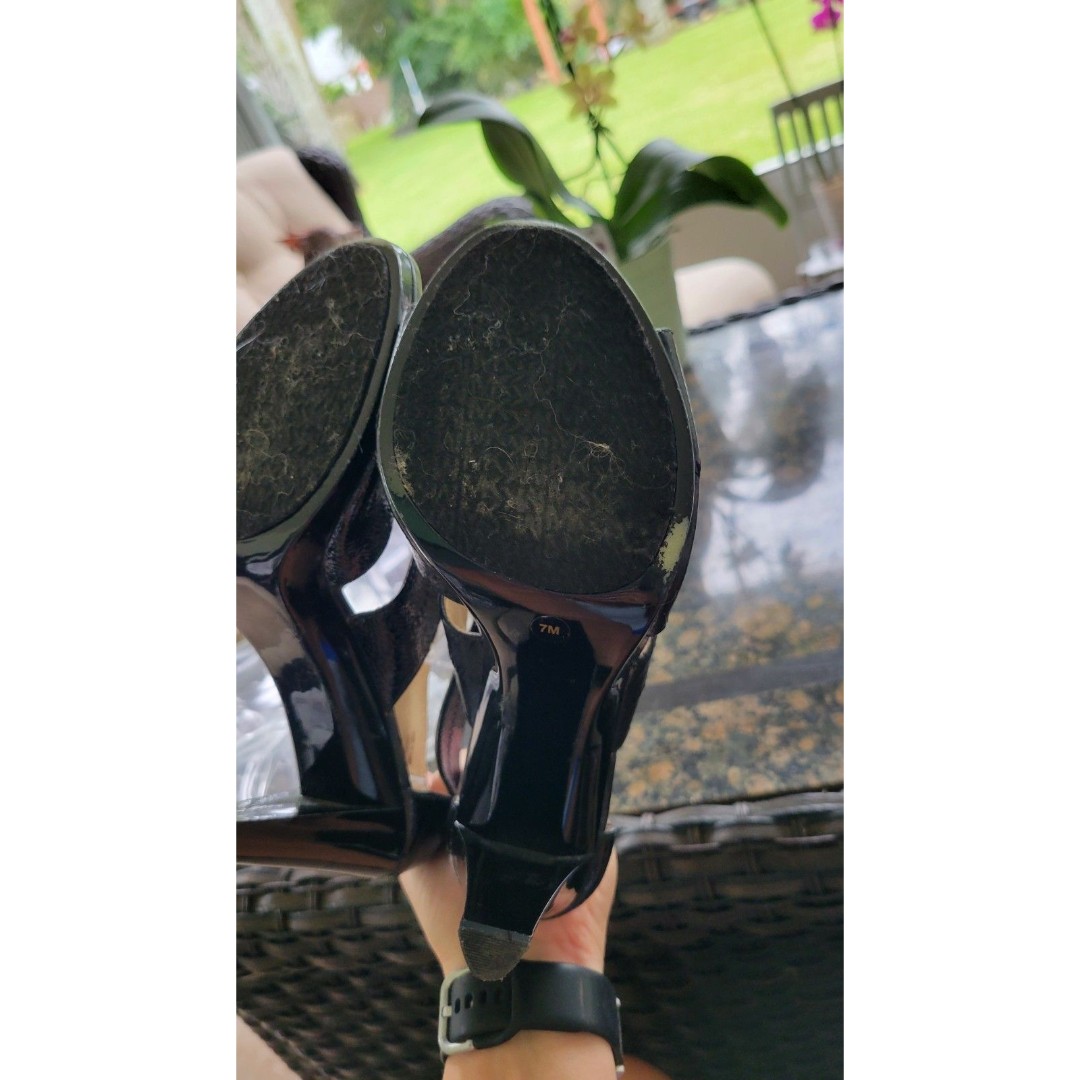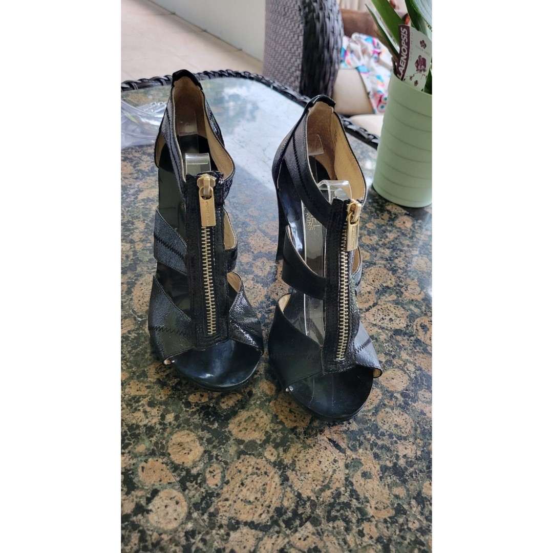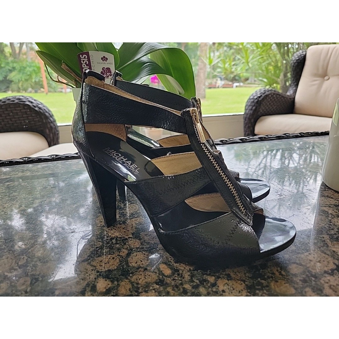 This sexy pair of high heels by Michael Kors in a black patent leather in an open strappy high heel with gold tone front zipper. The heel measures 3 3/4 inches tall. The soles of the shoes are manmade. The shoes are in very good condition with little or no visual wear other than a small spot pictured as well as the white spot on each shoe at the bottom. The whte spots are not broken, simply the black worn off i believe from where they were displayed.
