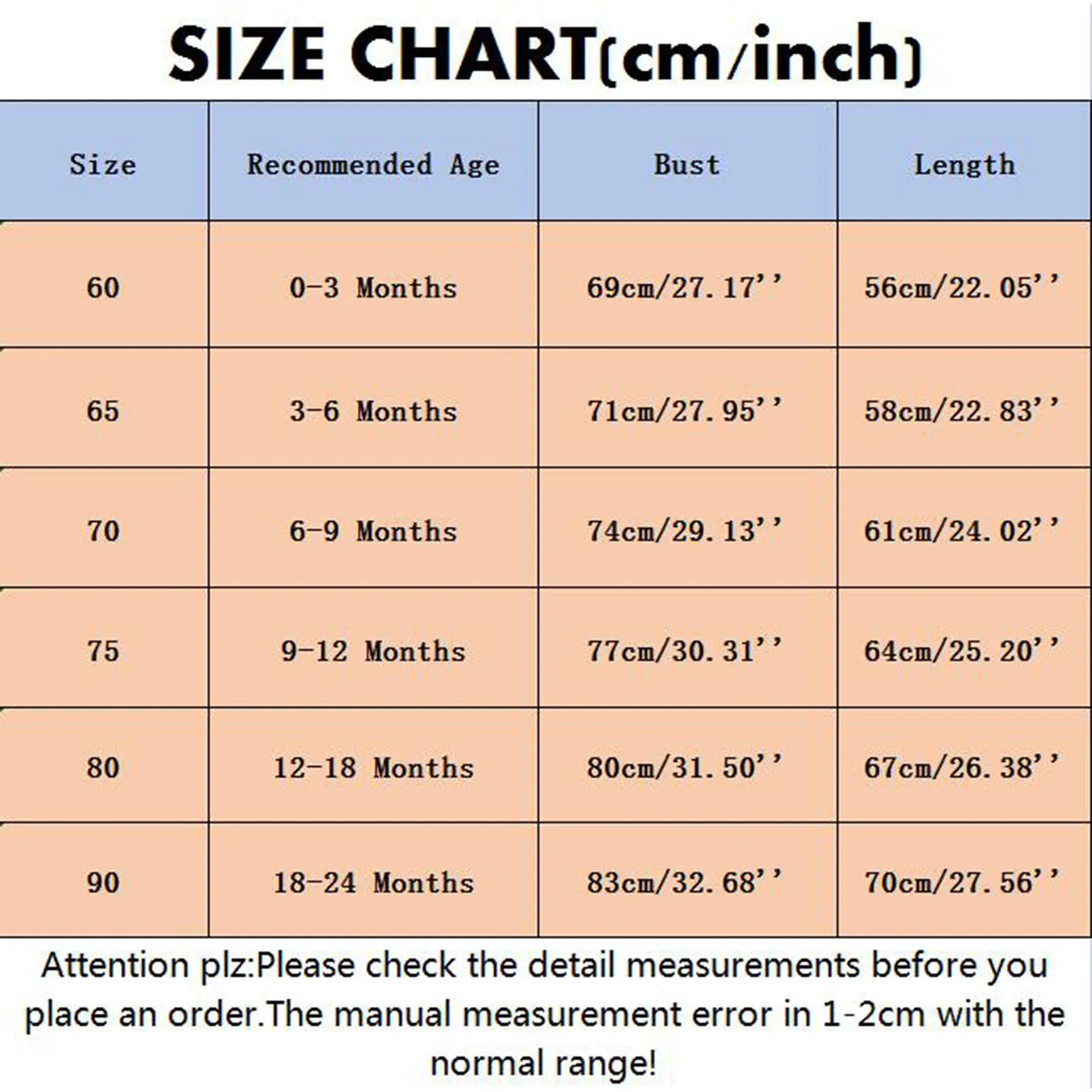 | Size:60 | Recommended Age:0-3 Months | Bust:69cm/27.17'' | Length:56cm/22.05'' |